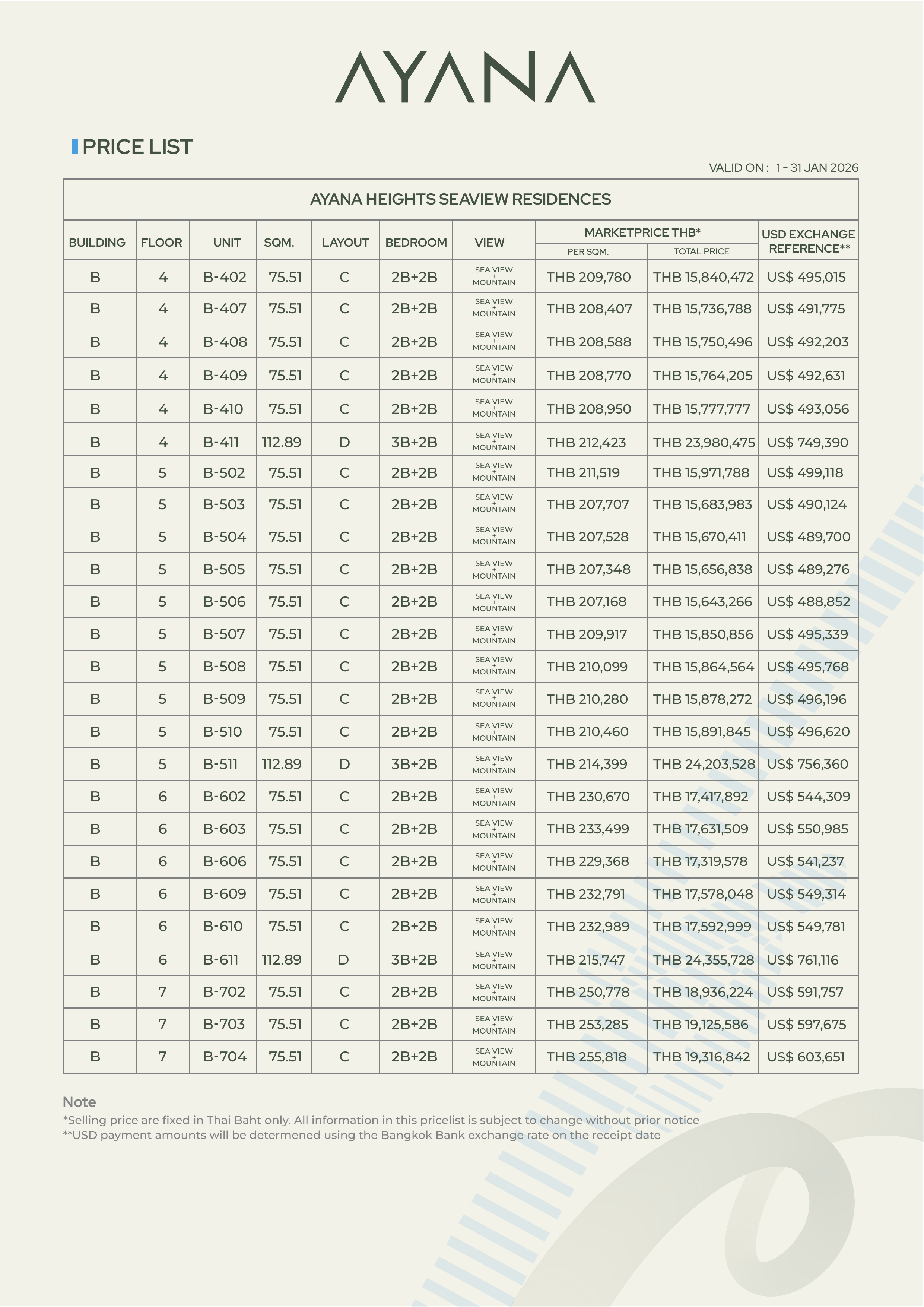 Юнит B-603 в проекте AYANA Heights Seaview Residences. Этаж: 6 Спальни: 2 Санузлы: 2 Площадь: 75.51 м² Цена: 17 631 516 THB. Актуальность и наличие подтверждаем по последнему прайс-листу. Запросите подборку и условия оплаты — ответим быстро и по делу.